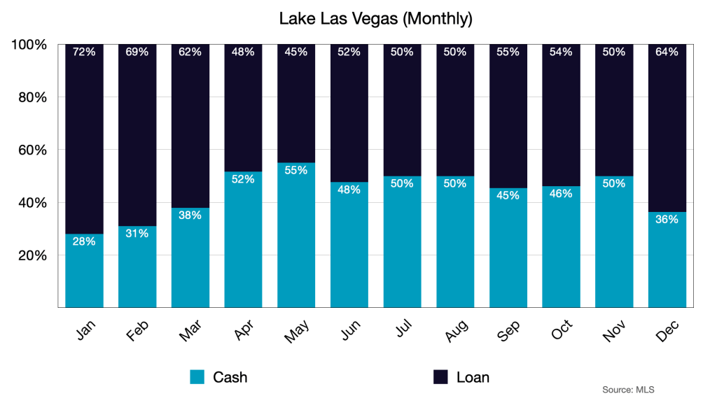 From 2009 to 2018, the Lake Las Vegas market was dominated by cash buyers with a peak of 76% of transactions being in cash*. The low interest rates of the latter years enticed some of those cash buyers to consider taking a low interest loan so they didn’t have to take too much out of their portfolio to buy a home. With rates going up, we are starting to see more cash entering the market. We’ll continue to watch this to see if it becomes a trend or if this is just normal variance.