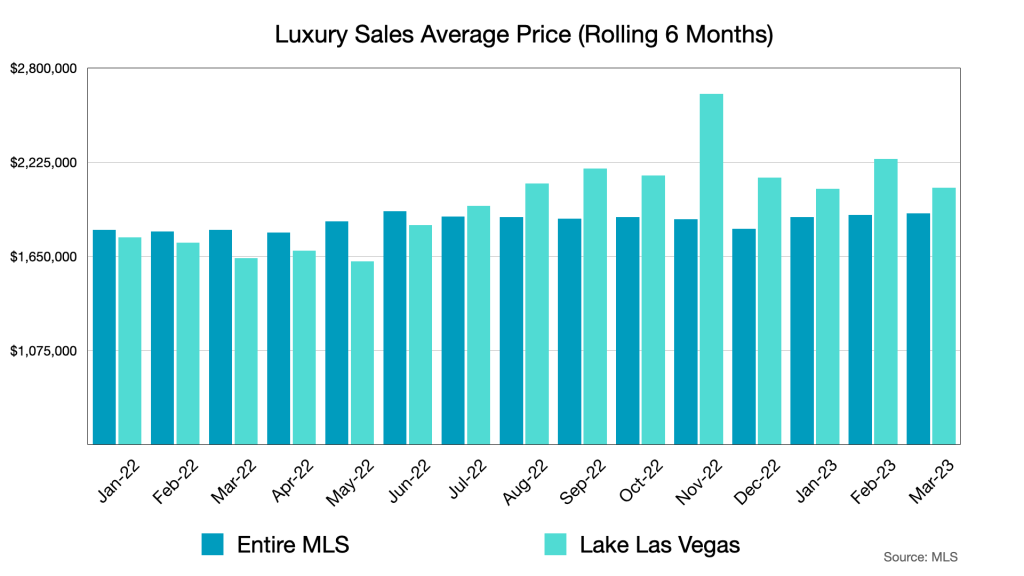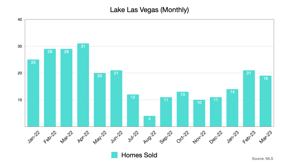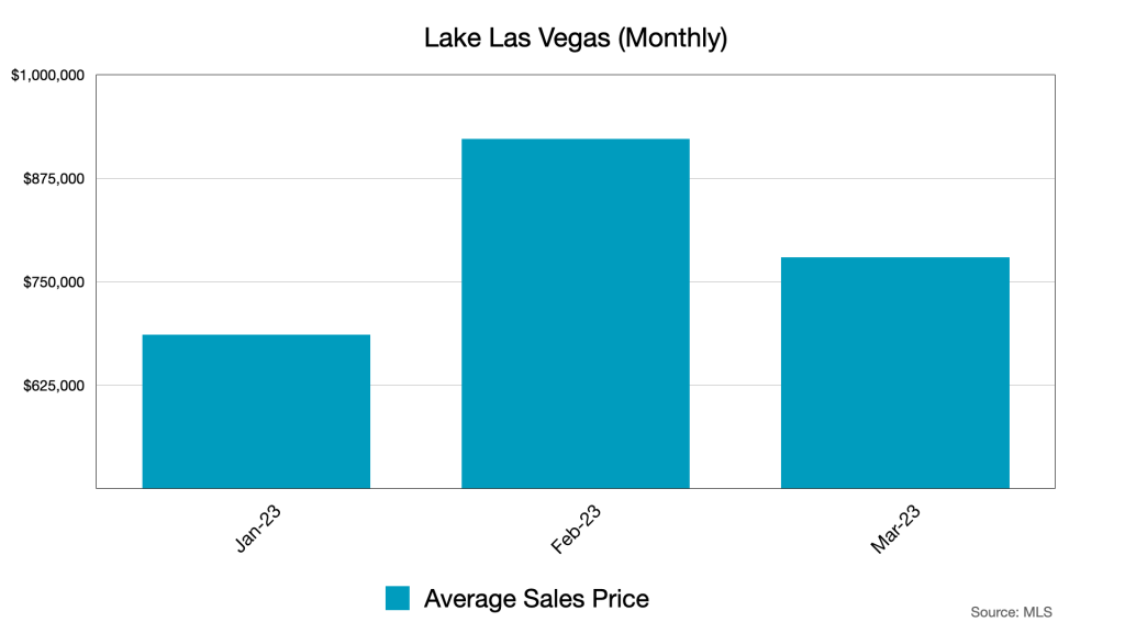 Pending sales are still hovering in the high teens and listings, while lower for March, are still outpacing. This isn’t unusual for Lake Las Vegas since the higher than average price point means most homes take longer to sell anyway.