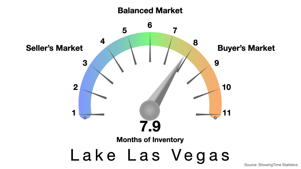 Inventory went up a bit from February’s 7.7 level, but there really isn’t much of a change here. Historically, Lake Las Vegas tends to land in the 7 to 15 month range so we are not in unusual territory here. Some buyers, however may see opportunity on this chart. This is the type of gauge chart their agent is going to show them, or at least attempt to explain to them when they go out looking for a deal.